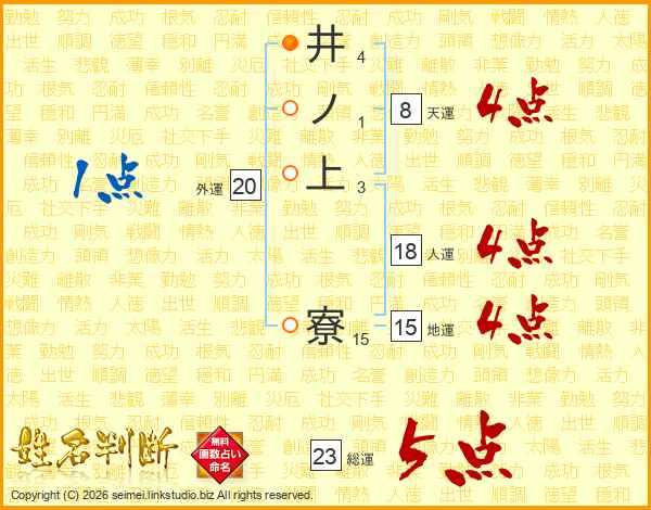 生活面を象徴する運勢です。外部から受ける影響力を表し、結婚運、家庭運や職場、環境への順応性を表します。総運から人運を引いた画数。姓や名が1文字の場合を除く。
