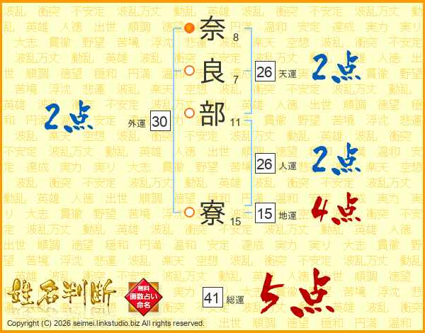 生活面を象徴する運勢です。外部から受ける影響力を表し、結婚運、家庭運や職場、環境への順応性を表します。総運から人運を引いた画数。姓や名が1文字の場合を除く。