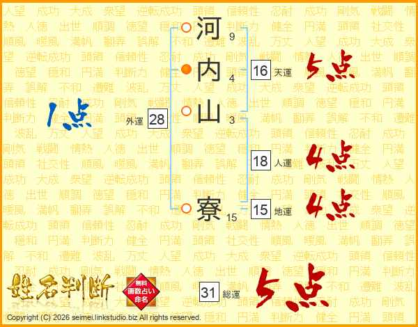 生活面を象徴する運勢です。外部から受ける影響力を表し、結婚運、家庭運や職場、環境への順応性を表します。総運から人運を引いた画数。姓や名が1文字の場合を除く。