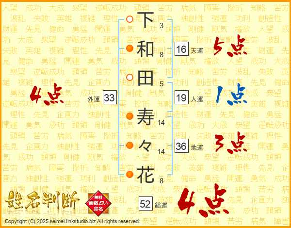 下(3画)和(8画)田(5画) 寿(14画)々(14画)花(8画)