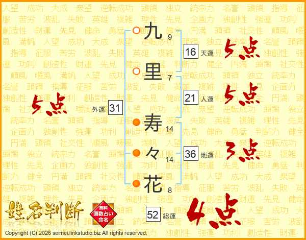 九(9画)里(7画) 寿(14画)々(14画)花(8画)