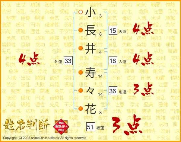 小(3画)長(8画)井(4画) 寿(14画)々(14画)花(8画)