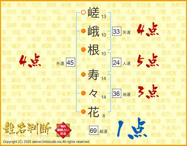 嵯(13画)峨(10画)根(10画) 寿(14画)々(14画)花(8画)