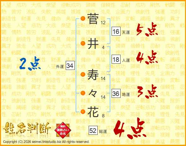 菅(12画)井(4画) 寿(14画)々(14画)花(8画)