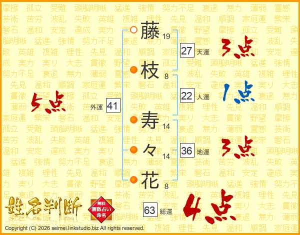 藤(19画)枝(8画) 寿(14画)々(14画)花(8画)