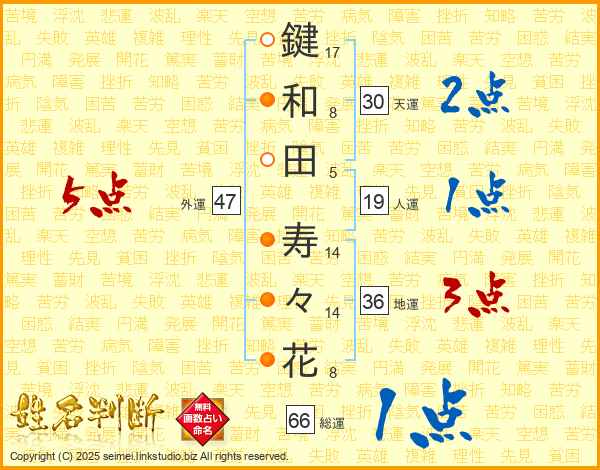 鍵(17画)和(8画)田(5画) 寿(14画)々(14画)花(8画)