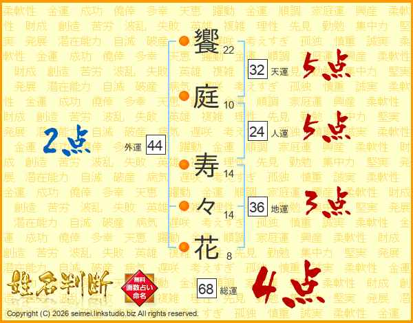 生活面を象徴する運勢です。外部から受ける影響力を表し、結婚運、家庭運や職場、環境への順応性を表します。総運から人運を引いた画数。姓や名が1文字の場合を除く。