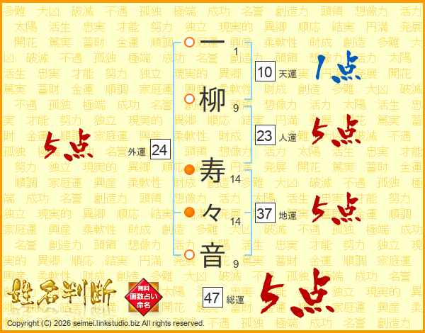 一(1画)柳(9画) 寿(14画)々(14画)音(9画)