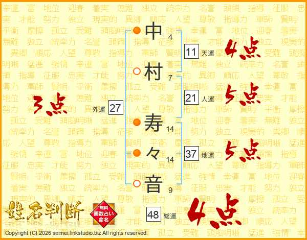 中(4画)村(7画) 寿(14画)々(14画)音(9画)