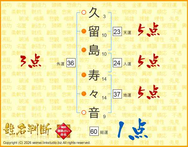 久(3画)留(10画)島(10画) 寿(14画)々(14画)音(9画)