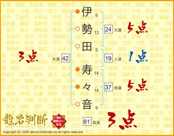 伊(6画)勢(13画)田(5画) 寿(14画)々(14画)音(9画)