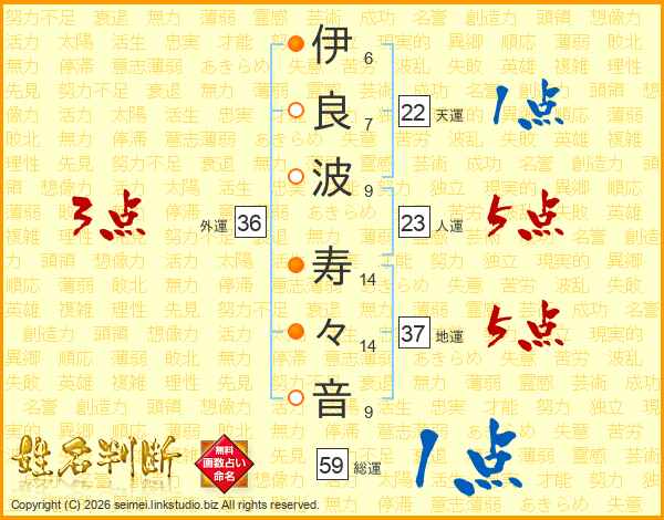 伊(6画)良(7画)波(9画) 寿(14画)々(14画)音(9画)