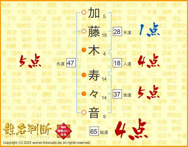 加(5画)藤(19画)木(4画) 寿(14画)々(14画)音(9画)