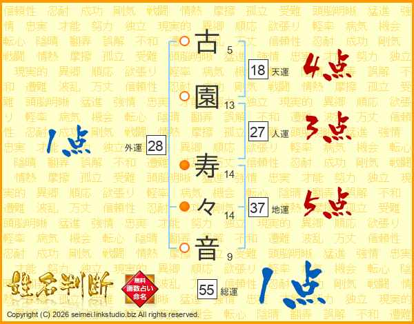 古(5画)園(13画) 寿(14画)々(14画)音(9画)