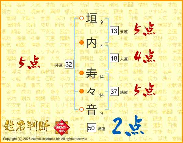 垣内寿々音さんの天運は13画の5点!