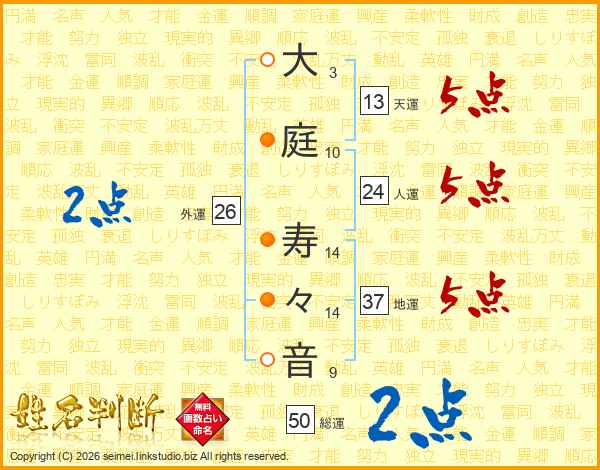 生活面を象徴する運勢です。外部から受ける影響力を表し、結婚運、家庭運や職場、環境への順応性を表します。総運から人運を引いた画数。姓や名が1文字の場合を除く。