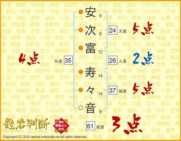 安(6画)次(6画)富(12画) 寿(14画)々(14画)音(9画)