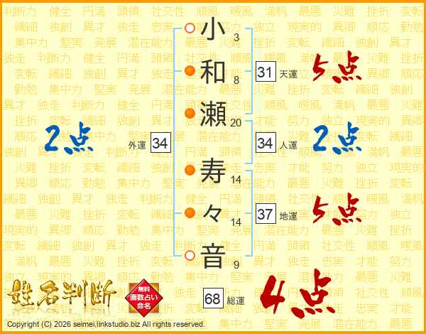 小(3画)和(8画)瀬(20画) 寿(14画)々(14画)音(9画)