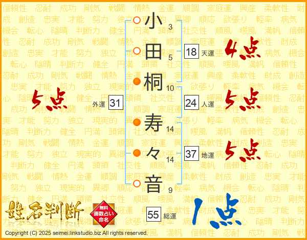 小(3画)田(5画)桐(10画) 寿(14画)々(14画)音(9画)