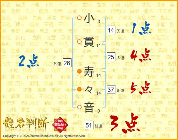 小(3画)貫(11画) 寿(14画)々(14画)音(9画)