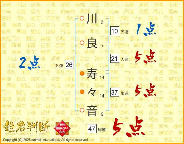 川(3画)良(7画) 寿(14画)々(14画)音(9画)