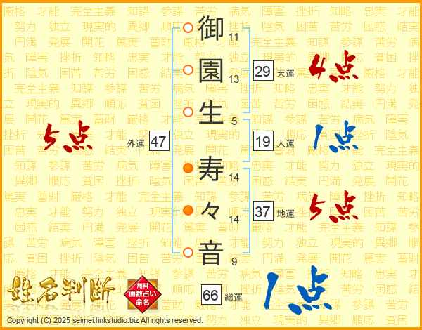 御(11画)園(13画)生(5画) 寿(14画)々(14画)音(9画)