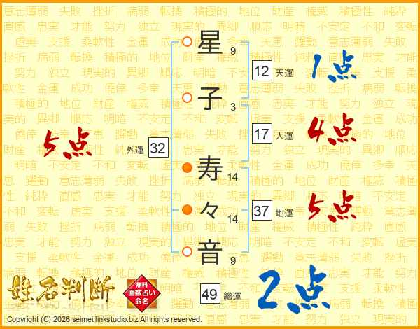 星(9画)子(3画) 寿(14画)々(14画)音(9画)