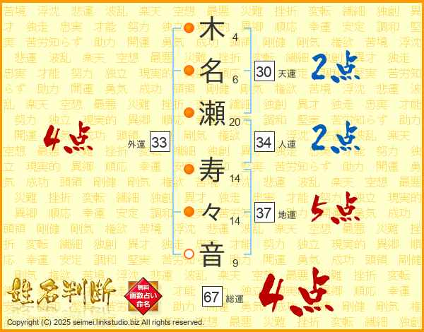 木名瀬寿々音さんの総運は67画の4点!