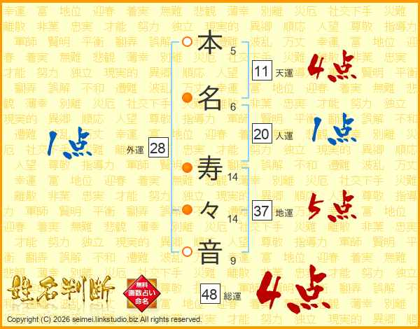 生活面を象徴する運勢です。外部から受ける影響力を表し、結婚運、家庭運や職場、環境への順応性を表します。総運から人運を引いた画数。姓や名が1文字の場合を除く。