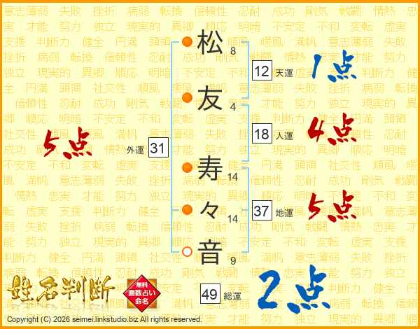 松(8画)友(4画) 寿(14画)々(14画)音(9画)