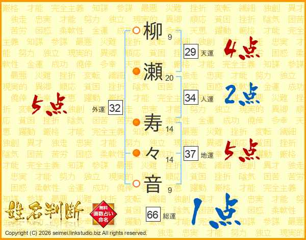 柳(9画)瀬(20画) 寿(14画)々(14画)音(9画)