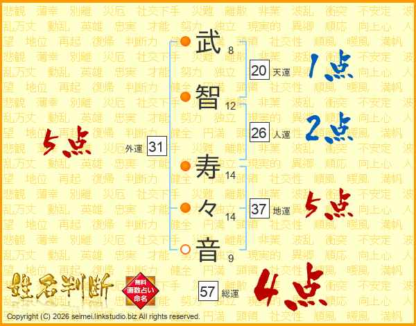 武(8画)智(12画) 寿(14画)々(14画)音(9画)