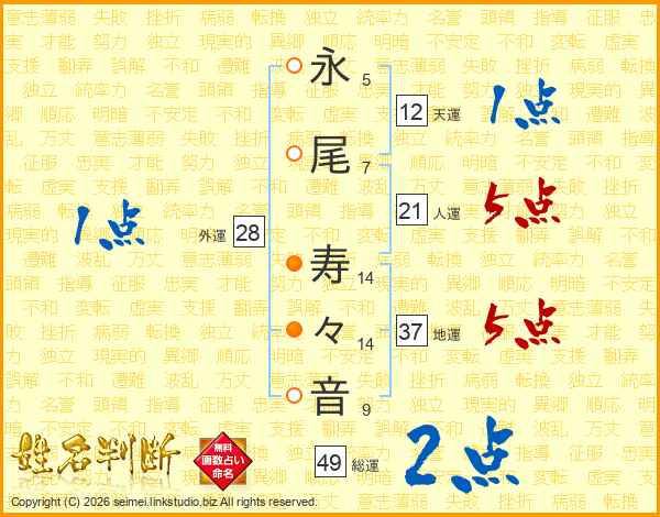 永(5画)尾(7画) 寿(14画)々(14画)音(9画)