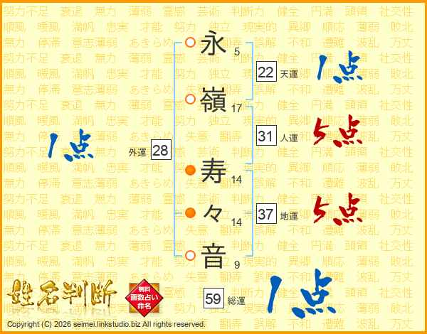 永(5画)嶺(17画) 寿(14画)々(14画)音(9画)
