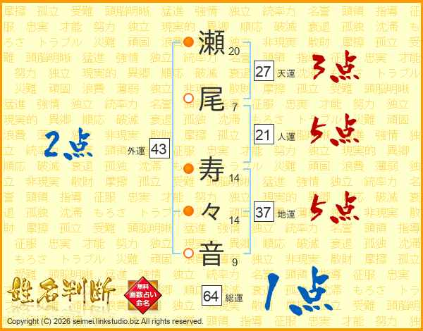 瀬(20画)尾(7画) 寿(14画)々(14画)音(9画)