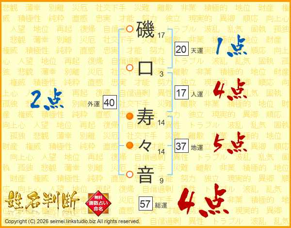 磯(17画)口(3画) 寿(14画)々(14画)音(9画)