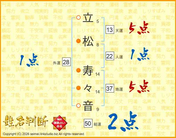 立(5画)松(8画) 寿(14画)々(14画)音(9画)