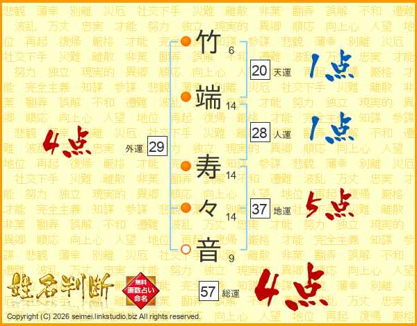竹(6画)端(14画) 寿(14画)々(14画)音(9画)