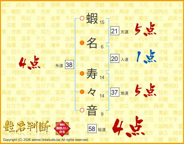 蝦(15画)名(6画) 寿(14画)々(14画)音(9画)