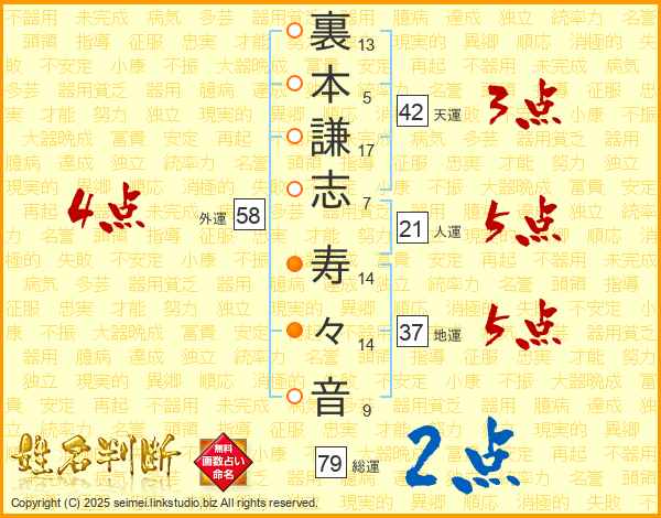 裏(13画)本(5画)謙(17画)志(7画) 寿(14画)々(14画)音(9画)