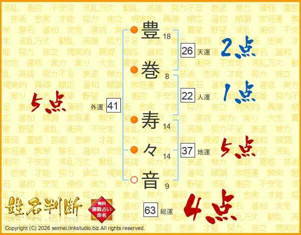豊(18画)巻(8画) 寿(14画)々(14画)音(9画)