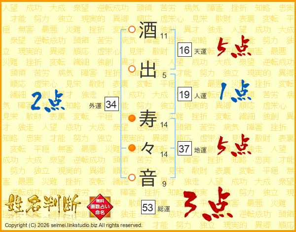 酒(11画)出(5画) 寿(14画)々(14画)音(9画)