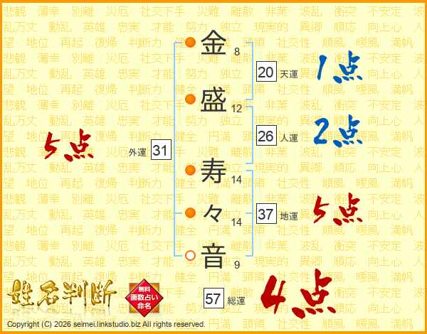 金(8画)盛(12画) 寿(14画)々(14画)音(9画)