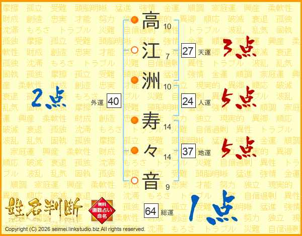 高(10画)江(7画)洲(10画) 寿(14画)々(14画)音(9画)