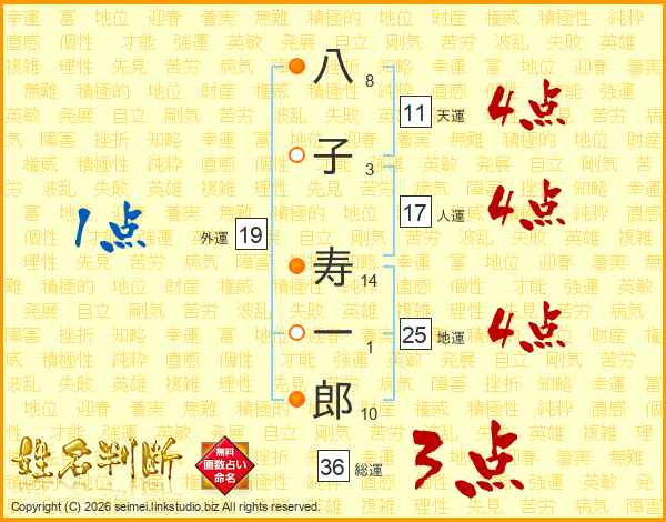 八(8画)子(3画) 寿(14画)一(1画)郎(10画)