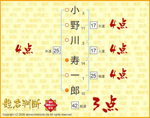 小(3画)野(11画)川(3画) 寿(14画)一(1画)郎(10画)