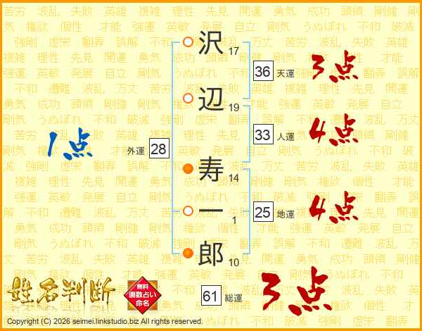 沢(17画)辺(19画) 寿(14画)一(1画)郎(10画)