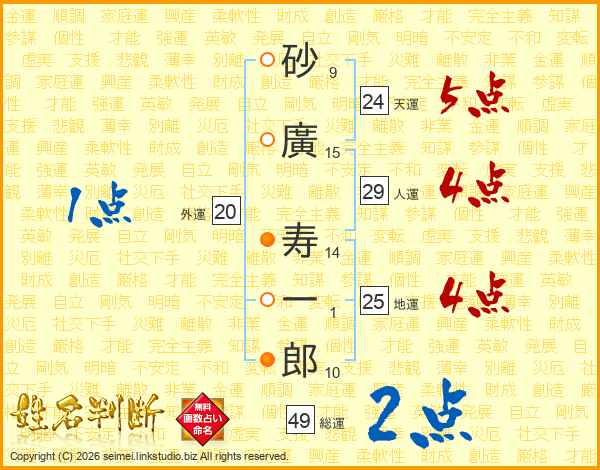 砂(9画)廣(15画) 寿(14画)一(1画)郎(10画)