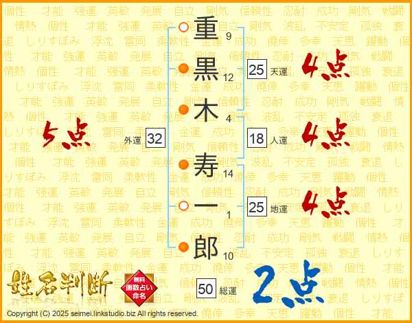 重(9画)黒(12画)木(4画) 寿(14画)一(1画)郎(10画)