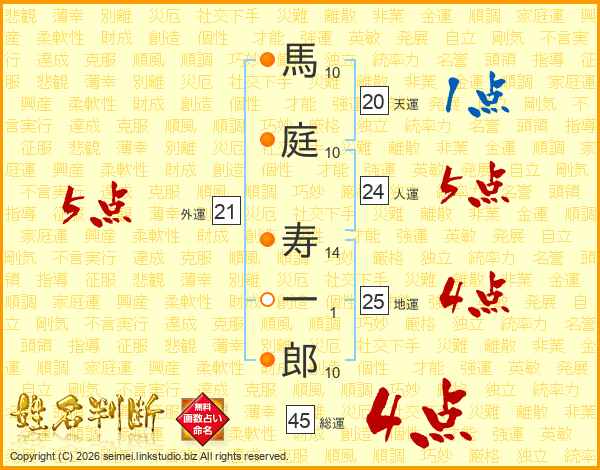 馬(10画)庭(10画) 寿(14画)一(1画)郎(10画)